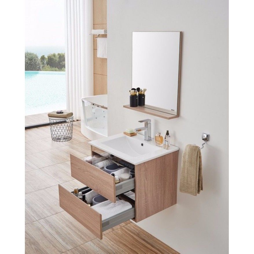 . Многослойное дерево 2. Два выдвижных ящика с доводчиками 3. Цвет: темный дуб . 4. Зеркало с полкой. 5.Раковина в комплекте.