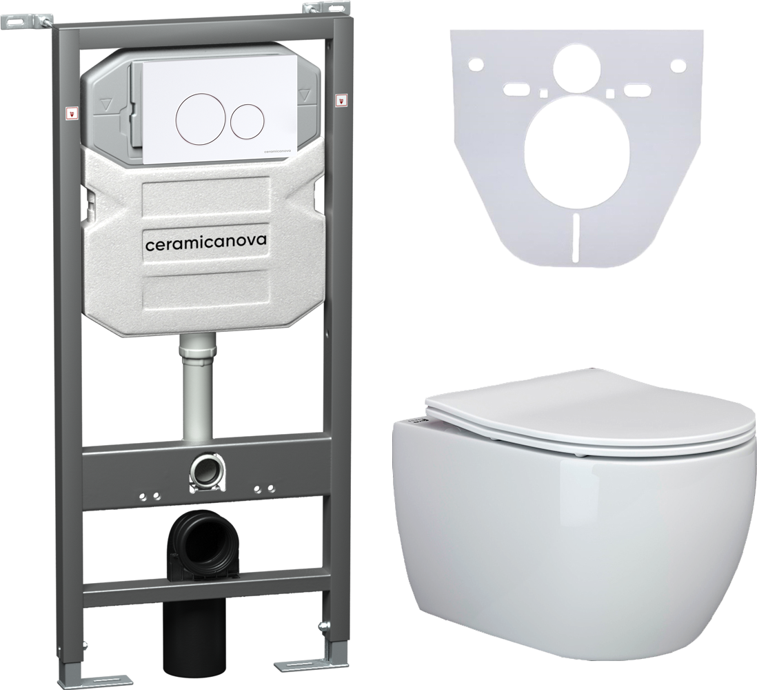 Сет 4 в 1: CN3001_1001W_1000Подвесной унитаз PLAY Rimless арт. CN3001Шумоизоляционная панель для инсталляции арт. CN1000Система инсталляции для унитазов CERAMICANOVA Envision с кнопкой смыва Round цвет белый и креплениями арт. CN1001WПодвесной безободковый унитаз Ceramica Nova Play Rimless, крышка микролифт, CN3001