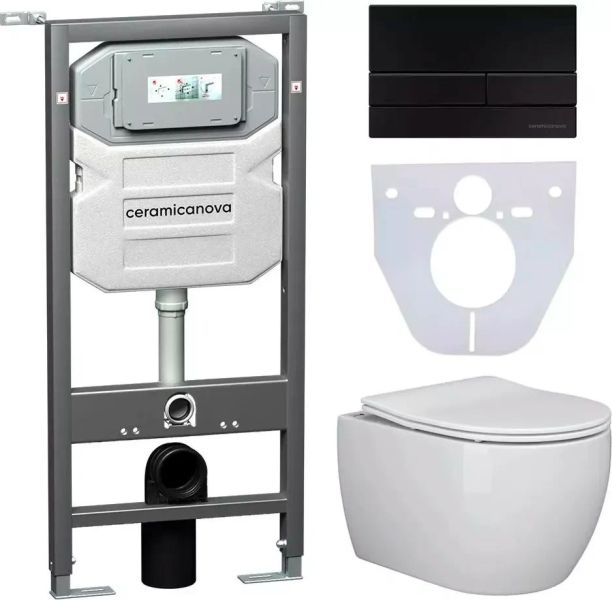 Сет 4 в 1: CN3001_1002B_1000Подвесной унитаз PLAY Rimless арт. CN3001Шумоизоляционная панель для инсталляции арт. CN1000Система инсталляции для унитазов CERAMICANOVA Envision с кнопкой смыва Flat цвет черный матовый, креплениями, арт. CN1002BПодвесной безободковый унитаз Ceramica Nova Play Rimless, крышка микролифт, CN3001