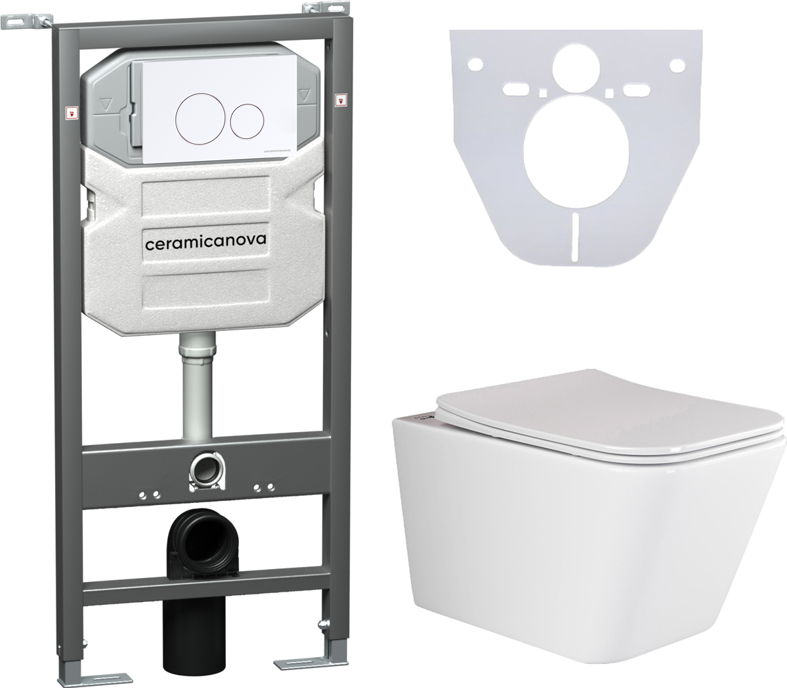 Сет 4 в 1: CN3007_1001W_1000Подвесной унитаз Metric Rimless арт. CN3007Шумоизоляционная панель для инсталляции арт. CN1000Система инсталляции для унитазов CERAMICANOVA Envision с кнопкой смыва Round цвет белый и креплениями арт. CN1001W Подвесной безободковый унитаз Ceramica Nova Metric Rimless, крышка микролифт, CN3007