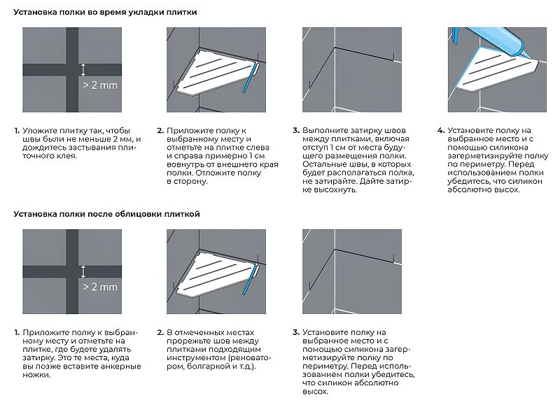 Металлическая полка RGW MT-03W 49279903-01 угловая БелаяПолка для душевой зоны RGW MT - современное решение для душевого пространства. Изготовлены из нержавеющей стали AISI 304, прочные, не ржавеют. Форма и размер полки, позволяет достичь максимальной стабильности конструкции и достаточной вместительности душевых принадлежностей, а легкая и быстрая установка в межплиточные швы без сверления плитки выгодно выделяет данное решение. Легкий монтаж без сверления плитки: Полки для душевой зоны, разработанные специально для монтажа после завершения ремонта, т. е. укладки плитки. Легко устанавливаются в любые угловые зоны в помещении, для этого прорезается шов между плитками, далее полочка вклеивается между плиткой на любой бытовой герметик. Полочки для душевой зоны RGW MT идеально подойдут для установки в душевое пространство, или в любую комнату, а так же найдут применение, на кухнях или в других помещениях.