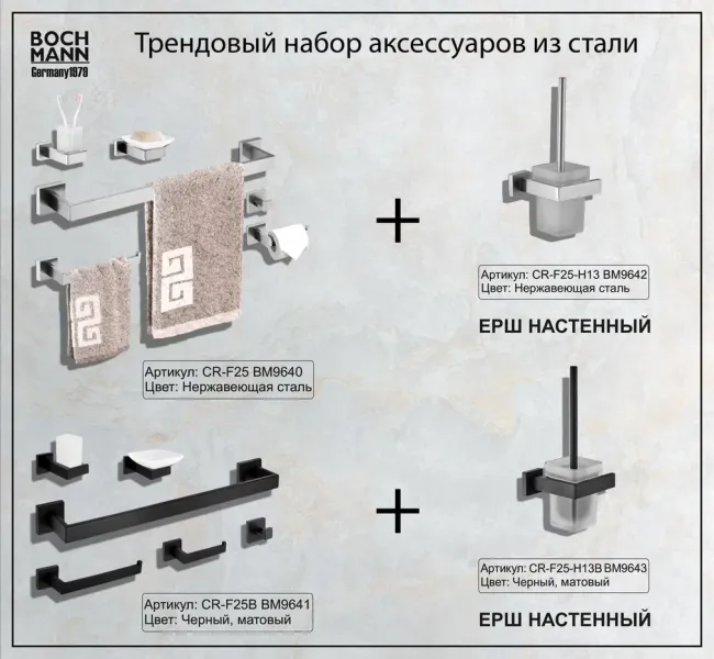 Ванная комната является одним из любимых и часто посещаемых мест человека. Мы проводим там больше 14 тысяч часов за всю жизнь, поэтому она обязательно должна быть не только уютной, но и эргономичной. Ни одна ванная комната не может обойтись без аксессуаров - незаметных на первый взгляд, но совершенно необходимых вещей, которые делают жизнь нашу намного комфортней. Они не только практичны, но и создают общую атмосферу ванной комнаты, придают ей индивидуальность и шарм.Дизайнерские аксессуары BOCH MANN стилистически завершают образ ванной комнаты, создавая целостную и продуманную концепцию. Их функциональный дизайн позволяет дополнить практически любой интерьер, а широкий ассортимент предоставляет свободу выбора. Так как срок службы аксессуаров для ванных и туалетных комнат напрямую зависит от материала, из которого они изготовлены, в производстве аксессуаров BOCH MANN используются только материалы самого высокого качества – нержавеющая сталь и закалённое стекло. Изделия из нержавеющей стали — рекордсмены по сроку службы, сохранению отличного внешнего вида и высоких эксплуатационных характеристик. Надежность конструкций аксессуаров BOCH MANN, профессиональное крепление и прочность покрытия позволяют использовать изделия не только в домашних условиях, но также и в общественных местах, включая отели и рестораны. Безупречность исполнения каждой детали, точность даже в мелочах — это признаки истинной элитарности бренда BOCH MANN.Многие дизайнеры советуют не приобретать аксессуары по отдельности, а отдавать предпочтения уже готовым наборам. Все потому, что при отдельной покупке вы потратите больше денег и можете купить не подходящие друг к другу по дизайну и внешним характеристикам предметы. Выбирая уже готовый набор, вы способны выдержать единую стилистику вашей ванной комнаты. Набор аксессуаров для ванной является не только практичным решением, но и прекрасным элементом декора, с которым ваша ванная комната станет местом, где вы сможете расслабиться, насладиться уютом и эстетикой. Наборы аксессуаров Bochmann для ванной не только помогут сделать вашу ванную максимально комфортной и функциональной, но и станут элегантным дополнением к интерьеру.Преимущества:- эстетический внешний вид;- высококачественные материалы – нержавеющая сталь и закаленное стекло;- тип крепления – скрытый, отличающийся повышенной надёжностью;- два варианта цветов – классический черный и универсальный хром;- чёткие формы каждой детали;- качество, проверенное годами. Состав набора: