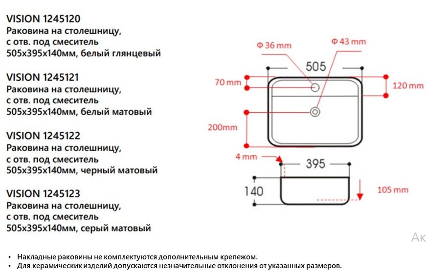 Накладная раковина Avimano Vision 1245121 50см белый матовый купить
