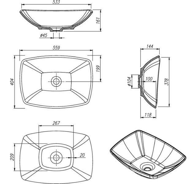 ? Монтаж: накладной? Материал: кварцевый композит? Размер: 558х404х165 мм? Комплектация: сифон МИНИ 1 1/4" х40 с нержавеющим выпуском 63мм, накладкой Агура и гибкой трубой (1 ½ - Ø40/50)