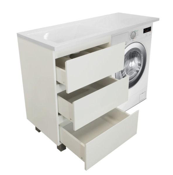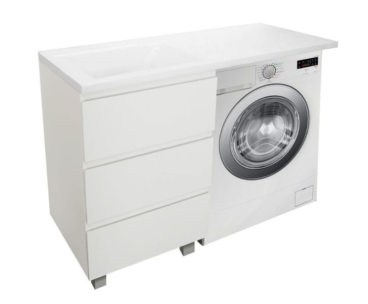 Приоритетом в выборе тумбы с раковиной является площадь ванной комнаты. Функциональная тумба с тремя ящиками решит вопрос для большинства покупателей. Тумба укомплектована раковиной из литьевого мрамора с удобной чашей, стиральная машина устанавливается под столешницей. Три ящика позволят распределить как крупные, так и мелкие вещи.