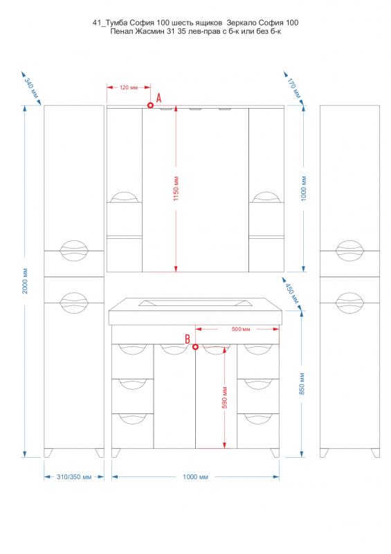 Напольная тумба под раковину Misty София с шестью ящиками 100см белый