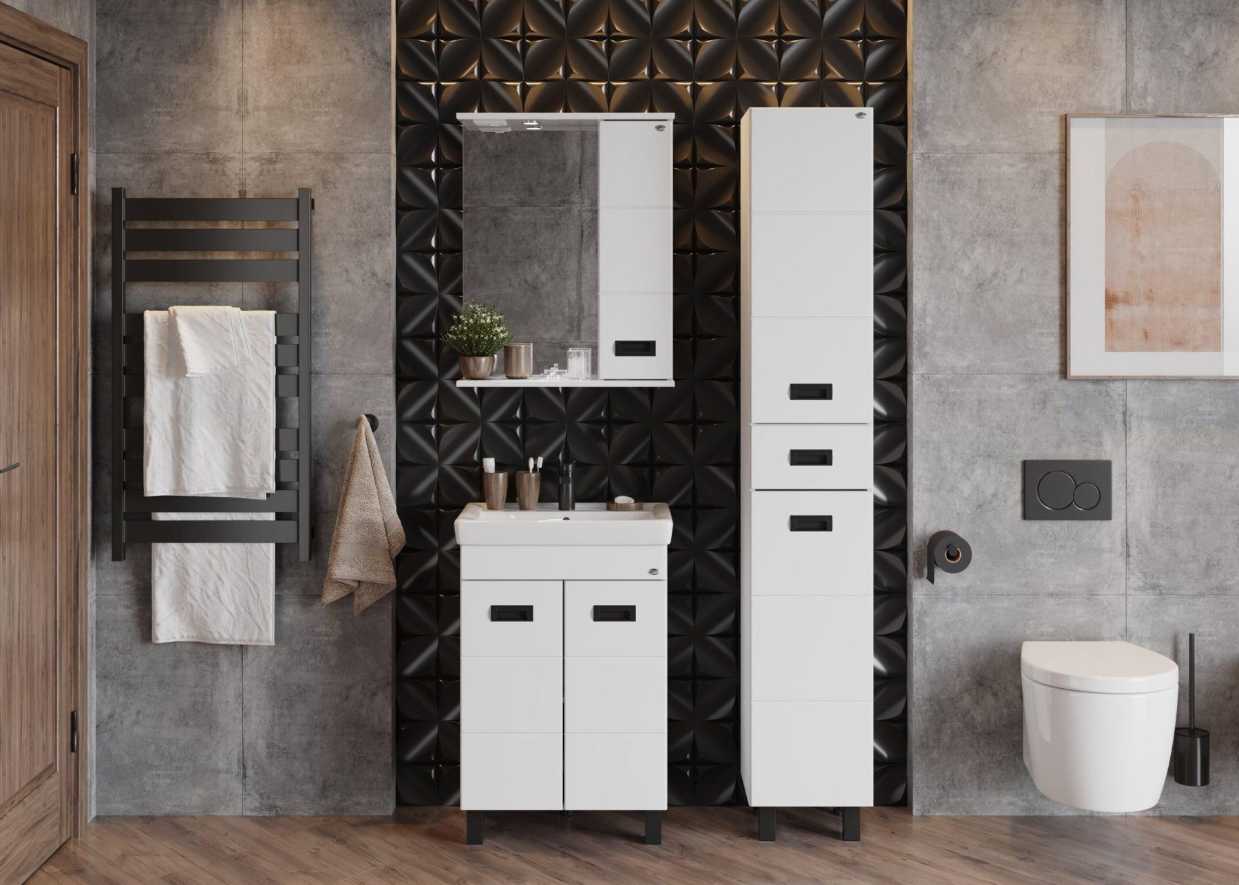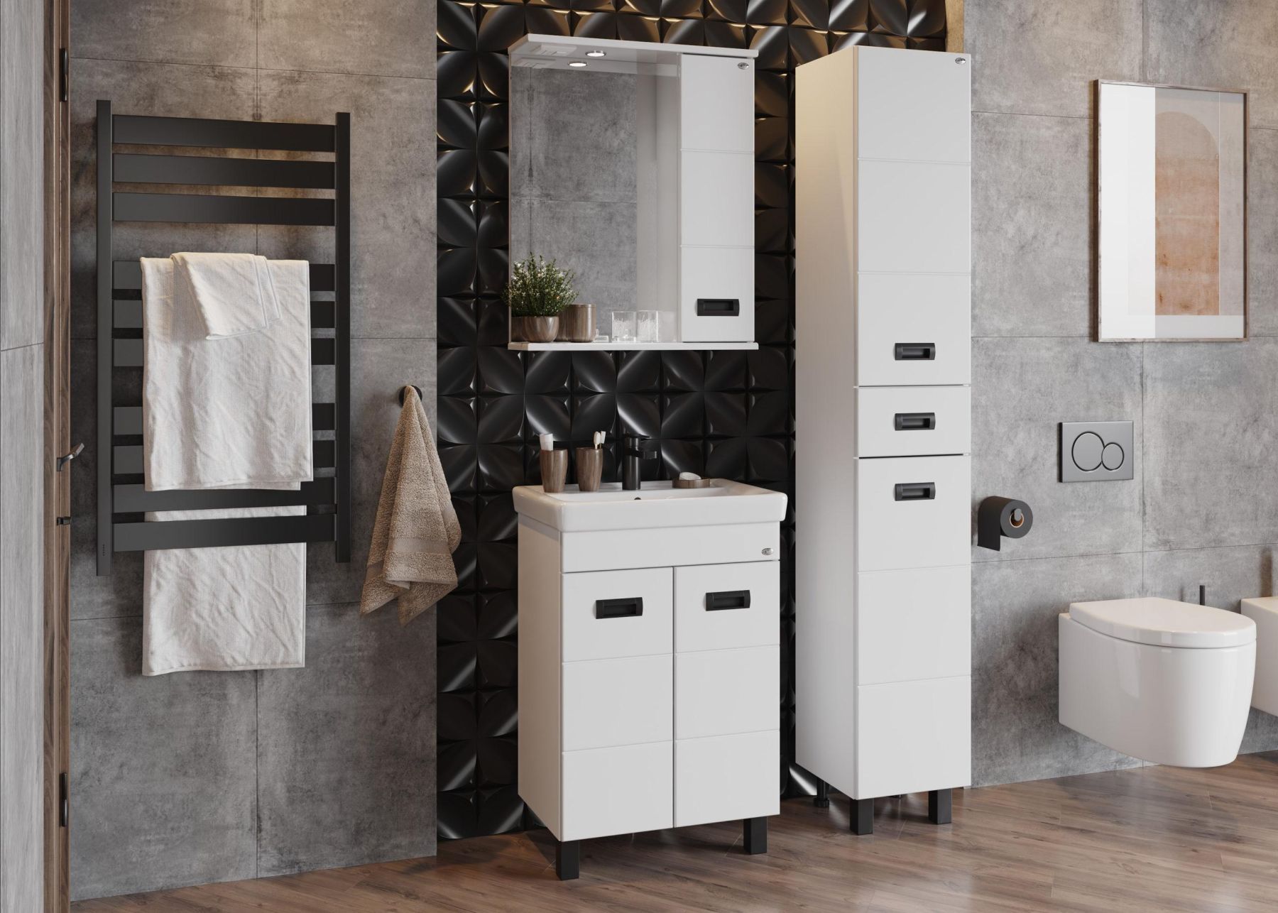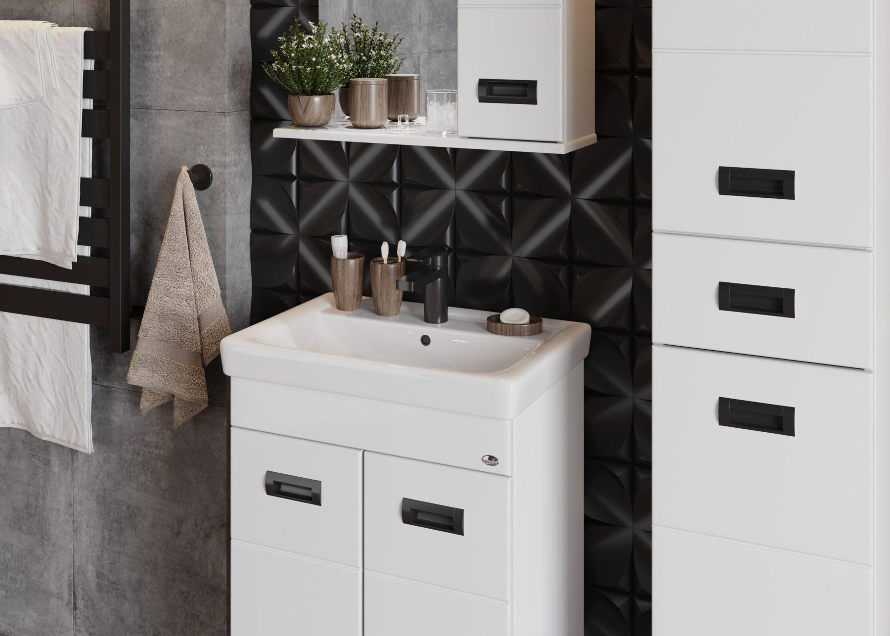 Глянцевый белый цвет фасада контрастирует с черной матовой фурнитурой, а ненавязчивая горизонтальная фрезеровка дополняет образ стильной и современной мебели.