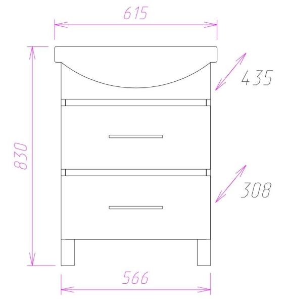 Размеры тумбы без учета раковины и ножек: 57х31x68 см.