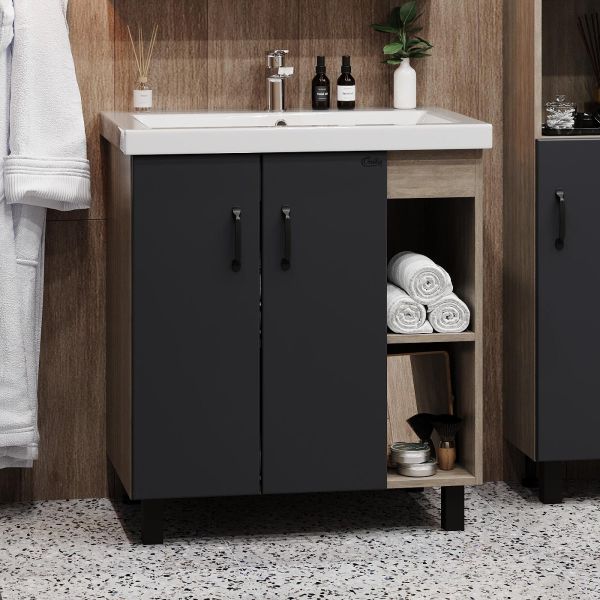 Открытые полки справа обеспечивают быстрый доступ к часто используемым аксессуарам, а пространство за распашными дверцами слева, снабженными системой плавного закрывания, станет удобным местом для хранения различных бытовых принадлежностей.