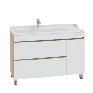 Напольная тумба Санта Марс 120 янтарная под раковину Sirius 120 с двумя ящиками и дверкой — это не только стильный, но и функциональный элемент для вашей ванной комнаты. Изготовленная из высококачественного ЛДСП, она прослужит долго, не теряя своей привлекательности. Фасады тумбы покрыты глянцевой эмалью, что придает им свежий и современный вид. Два ящика, снабженные доводчиками, обеспечат комфортное использование и удобное хранение, петли на дверке имеют петли с плавным закрыванием.