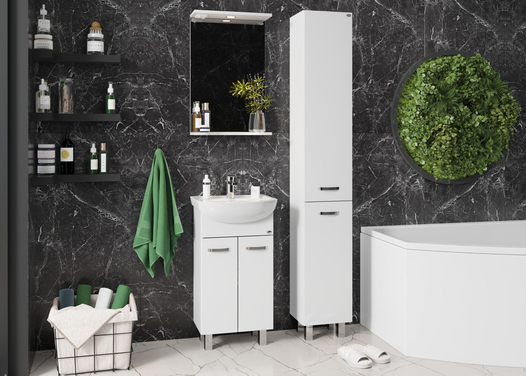 Белый глянцевый цвет, строгие формы без декора и дизайнерские хромированные ручки на двух распашных дверях с механизмом плавного закрывания скрывают просторное внутреннее пространство для размещения необходимых бытовых принадлежностей.
