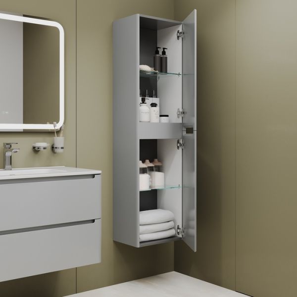 Подвесной пенал Edifice в стильном светло-сером цвете – воплощение современного минимализма. Мягкие линии корпуса в сочетании с удобными интегрированными ручками выглядят свежо и актуально. Смотрится компактным, легким и не усложняет процесс уборки в ванной благодаря подвесной конструкции.