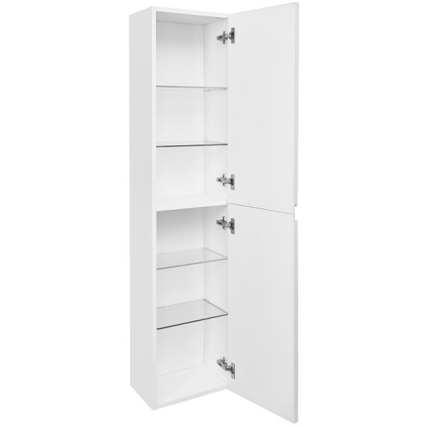 Дополняет комплект мебели OLETA шкаф-колонна в дизайне коллекции. Открытие фасадов осуществляется с помощью удобной профильной ручки. За фасадами, оснащенными петлями Hettich с плавным закрыванием, находятся регулируемые по высоте полочки из просветленного стекла.