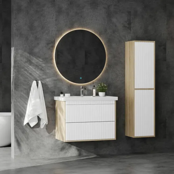 Рифленый белый матовый фасад с покрытием SoftTouch и корпус цвета дуба с роскошной текстурой подчеркнет изысканный вкус владельца и станет центральным элементом декора.