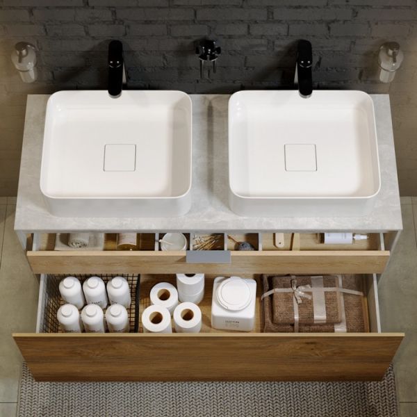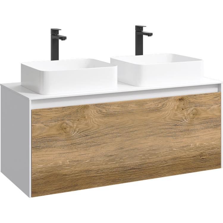 Подвесная тумба под раковину Aqwella Mobi MOB0112W+MOB0712DB 120 смКоллекция Mobi гармонично вписывается в интерьер любой современной ванной комнаты. Так как существует возможность комбинировать фасады и корпуса трех цветов: бетон светлый, дуб балтийский и белый глянец.Подвесная тумба 120 см с двумя ящиками: основной и внутренний, скрытый за фасадом. Цвет белый/дуб балтийский; с умывальником