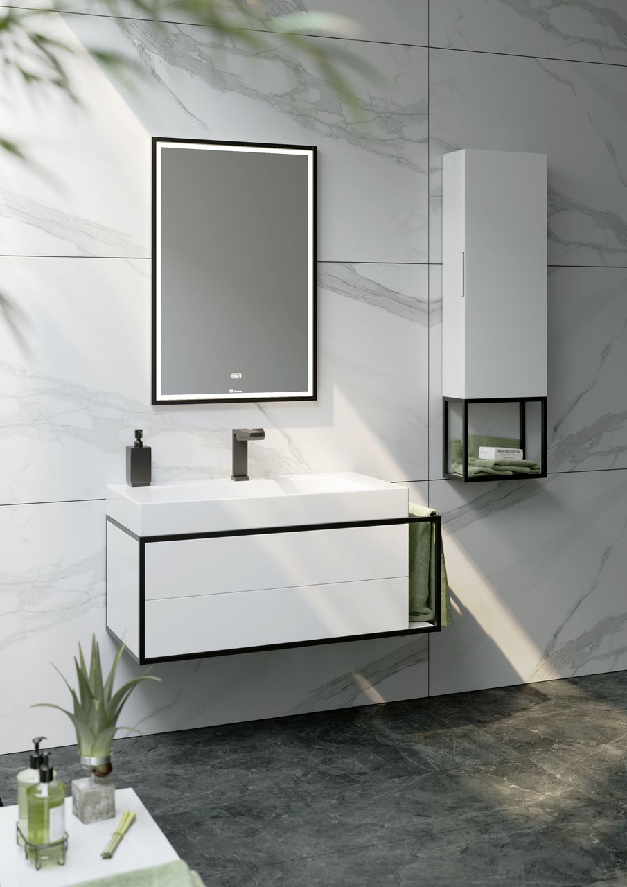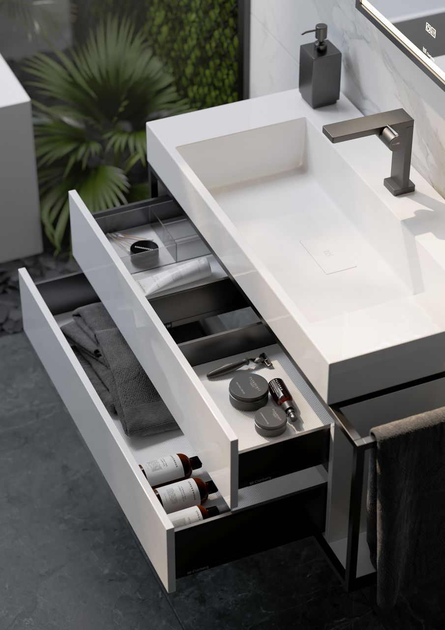 Подвесная тумба под раковину Clarberg Logic 100 L LOG0110L с двумя ящиками и дополнительной консолью для полотенец справа. Главная особенность коллекции - это применение алюминиевого анодированного профиля в чёрном цвете.Технические данные:Цвет: белый.