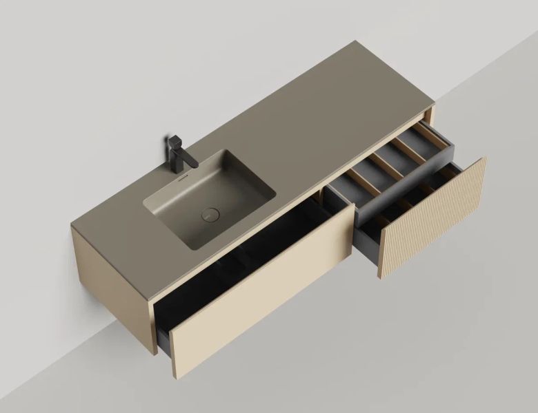 Наполнение для тумбы включает: блоки ячеек для тумб, коврики и комплект внутренней подсветки, которые помогут организовать пространство и создать более удобный доступ к вещам.Тумба DOMINO, дополненная столешницей COSTA из каменного литья S-Stone, гарантирует практичность и простоту ухода.
