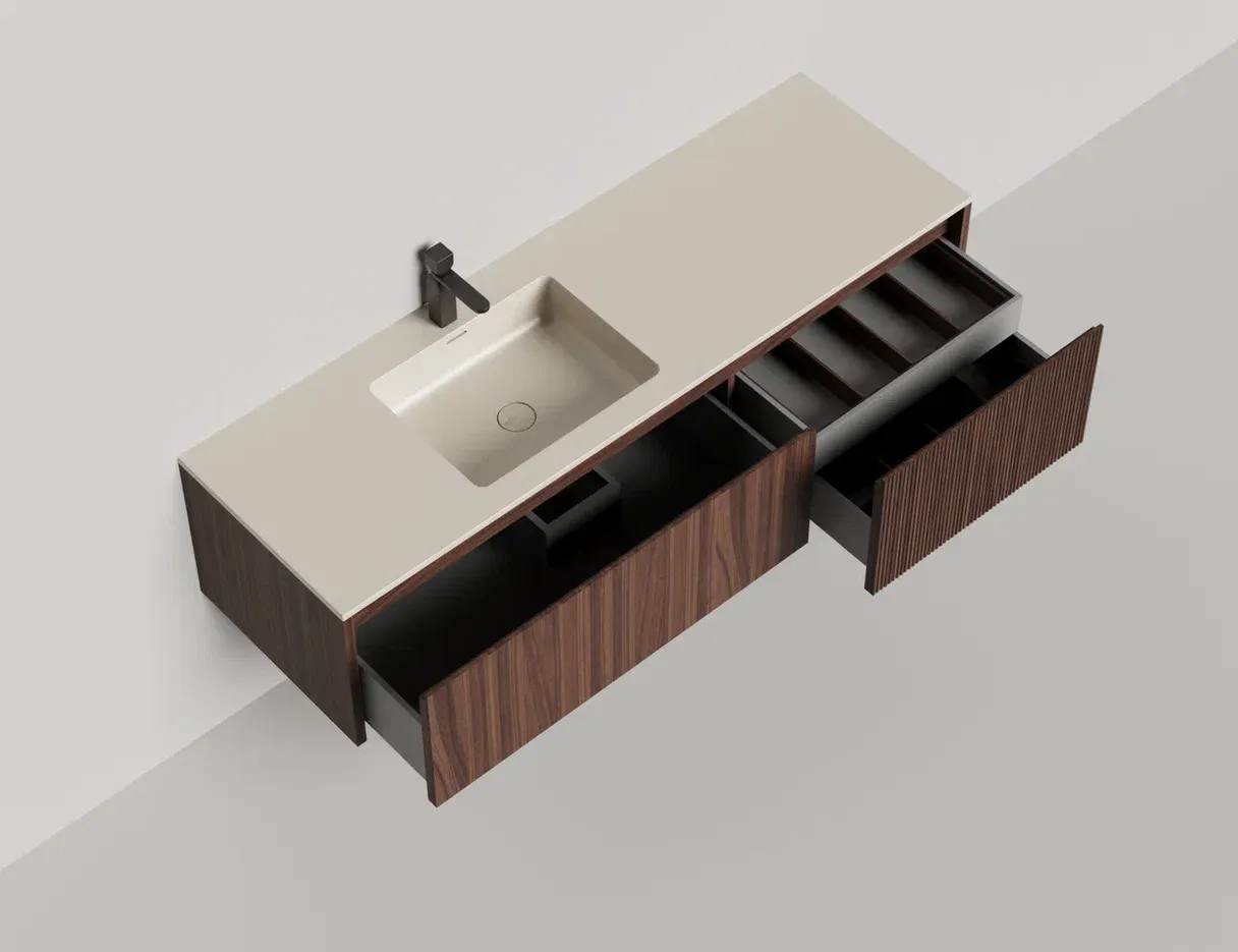 Наполнение для тумбы включает: блоки ячеек для тумб, коврики и комплект внутренней подсветки, которые помогут организовать пространство и создать более удобный доступ к вещам.Тумба DOMINO, дополненная столешницей COSTA из каменного литья S-Stone, гарантирует практичность и простоту ухода.