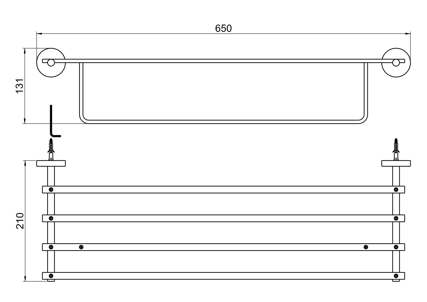 Общий размер (мм): 650*131*210Основной материал: латунь, нержавеющая стальКоличество полок: 2Метод крепления: шурупыМонтаж: на стенуНазначение: аксессуарыТип продукта: полка для полотенецГарантия (лет): 5Легкая установка