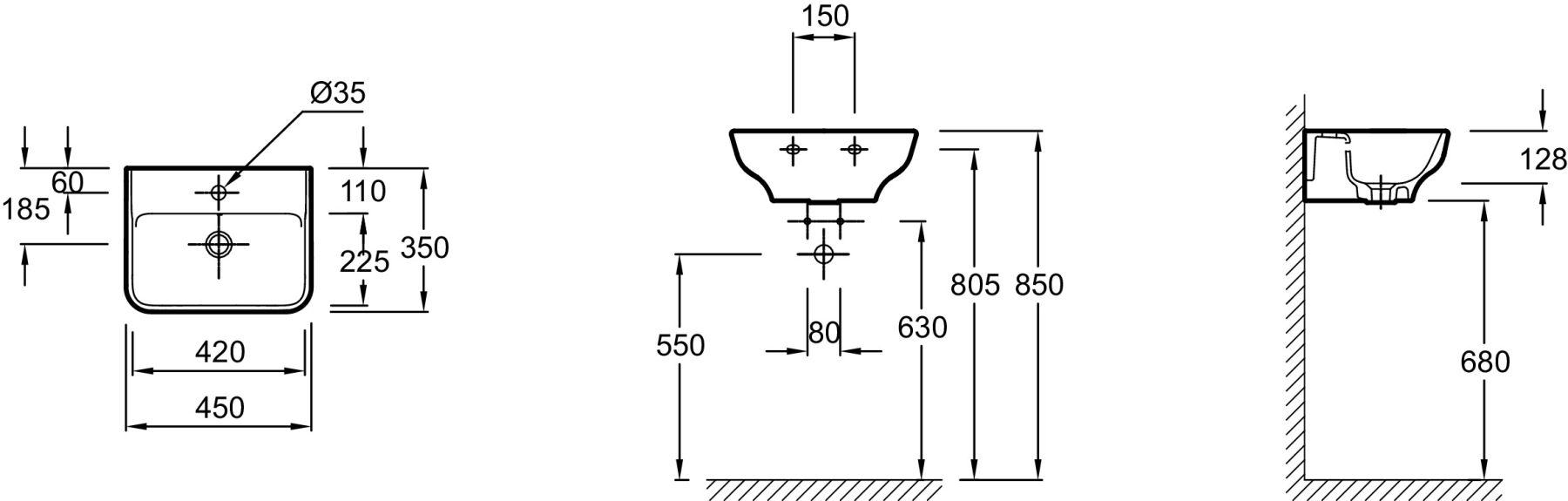 РАЗМЕТКА СВЕРЛЕНИЯ ОТВЕРСТИЯ ДЛЯ СМЕСИТЕЛЯ: 1 отверстие для смесителя