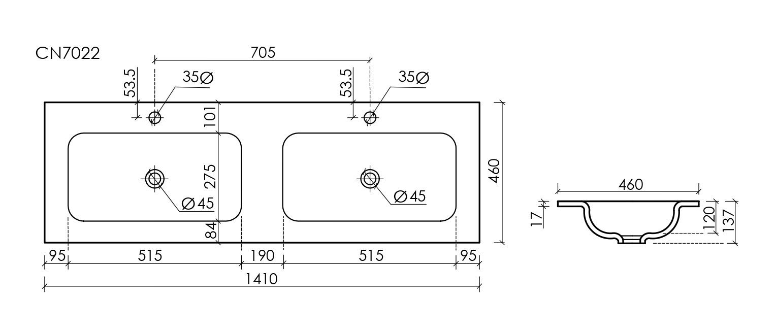 - Коллекция Grace. Размер 1410x457x137 мм, с двумя чашами и отверстиями под смеситель.