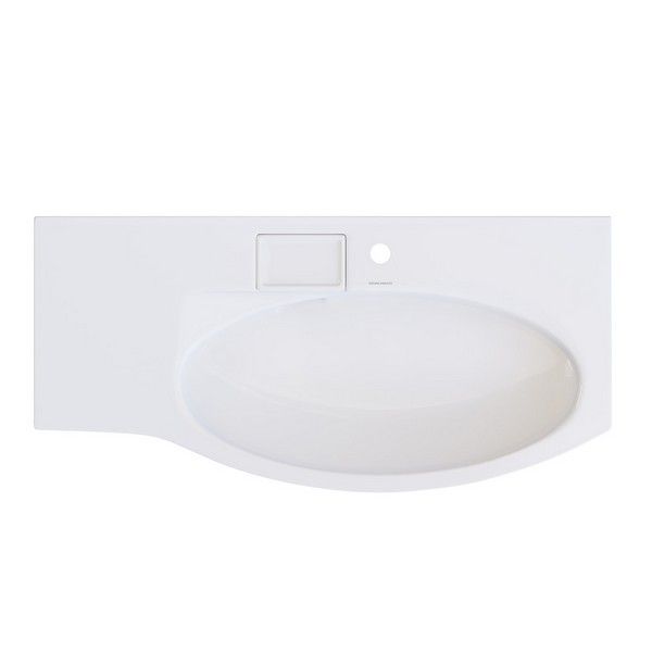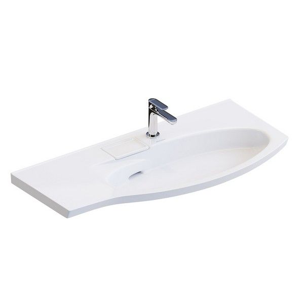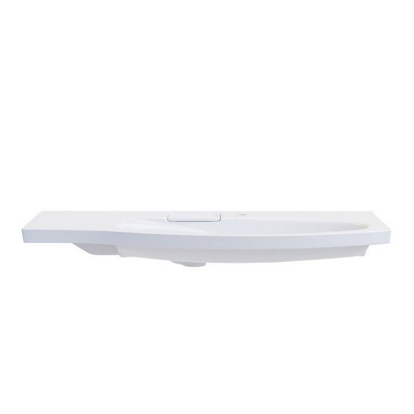 Изогнутая мебельная раковина без необходимости использования донного клапана, ширина 100 см. Отверстие слив\перелив спрятано в небольшой бокс, закрытый керамической крышкой с бортиком. Чаша раковины расположена справа. Сочетается с тумбой Riva.