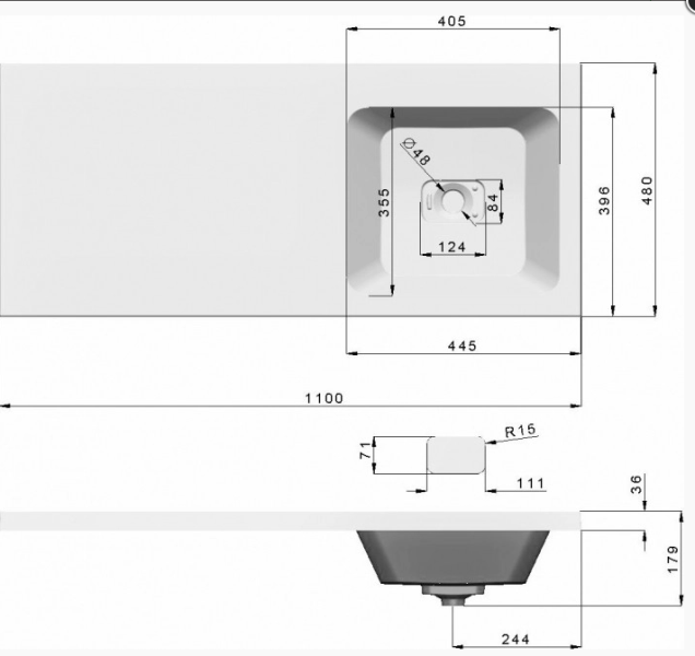 Одно отверстие под смеситель по центру чаши. Подходит к стиральным машинам глубиной до 470 мм.