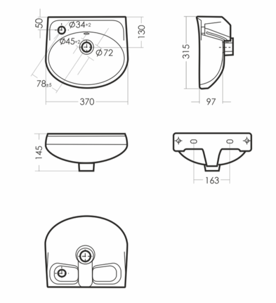 Размеры умывальника: 370 x 315 x 145