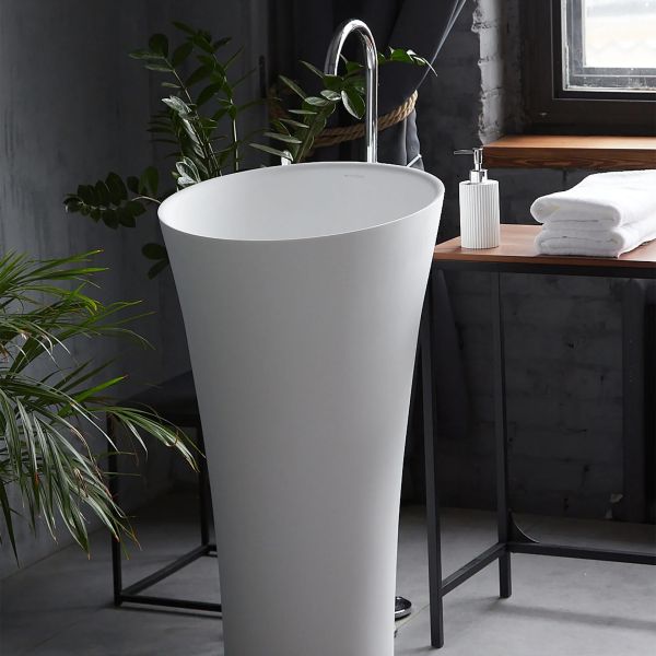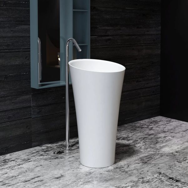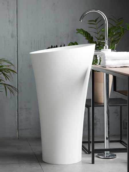 Раковина из искусственного камня для ванной комнаты. Похожие модели – Montebianco Pisa и Pisa Rubinetto.Модель напольного размещения. Безусловным практическим и эстетическим преимуществом является коническая форма. Раковина занимает мало места на полу, при этом за счет расширения к верху функционально очень удобна: вода не разбрызгивается и не выплескивается из объемной, чуть наклоненной к пользователю чаши. Благодаря большой видимой площади белоснежно-матовой, бархатистой поверхности великолепно выглядит в интерьере, является самостоятельной композицией. Популярна среди владельцев частных домов с просторными, светлыми помещениями ванных комнат.Высота раковины и небольшой наклон чаши удобны как для высоких людей, так и небольшого роста, в том числе детей. Крепление смесителя либо к стене, либо напольное, на ножке, подчеркивает современный дизайн и технологичность конструкции. Материал не впитывает влагу, не порист, непроницаем для плесени, бактерий и грибков.Отличия от моделей Pisa и Pisa Rubinetto – в размерах чаши (у Pisa Cono она более объемная), форме (две другие модели – прямые) и месте размещения смесителя (в Pisa Rubinetto он устанавливается на поверхность раковины).