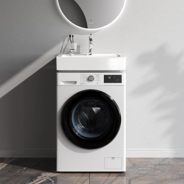Размещение раковины над стиральной машиной позволяет максимально эффективно использовать ограниченное пространство, особенно в маленьких ванных комнатах.