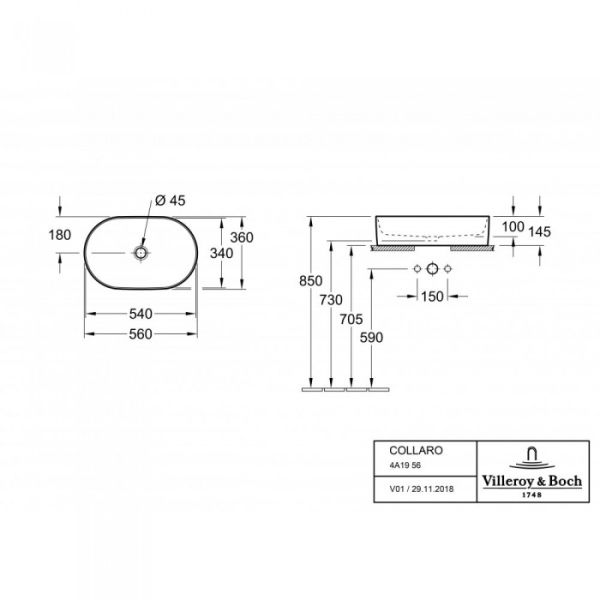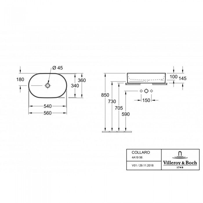 Раковина накладная Villeroy Boch Collaro 36 x 56 см 4A195601 купить