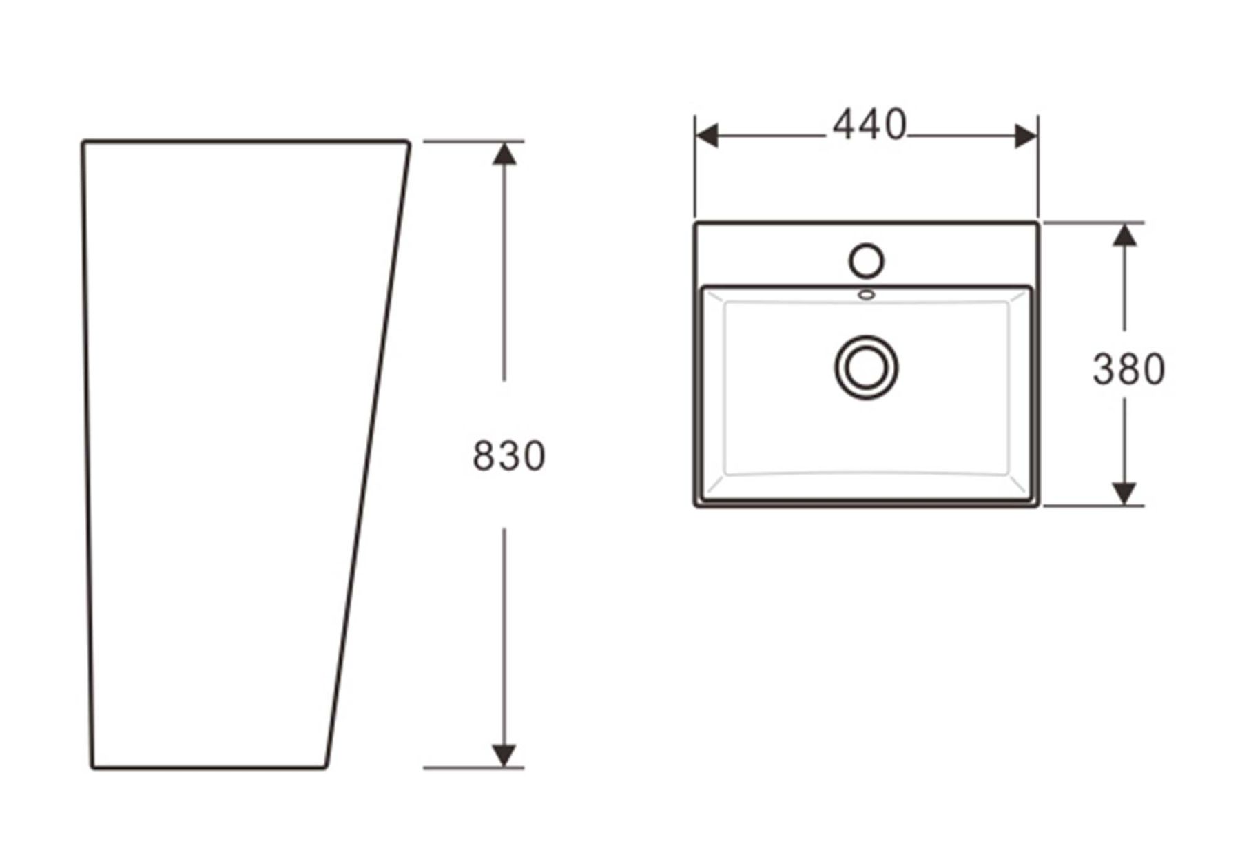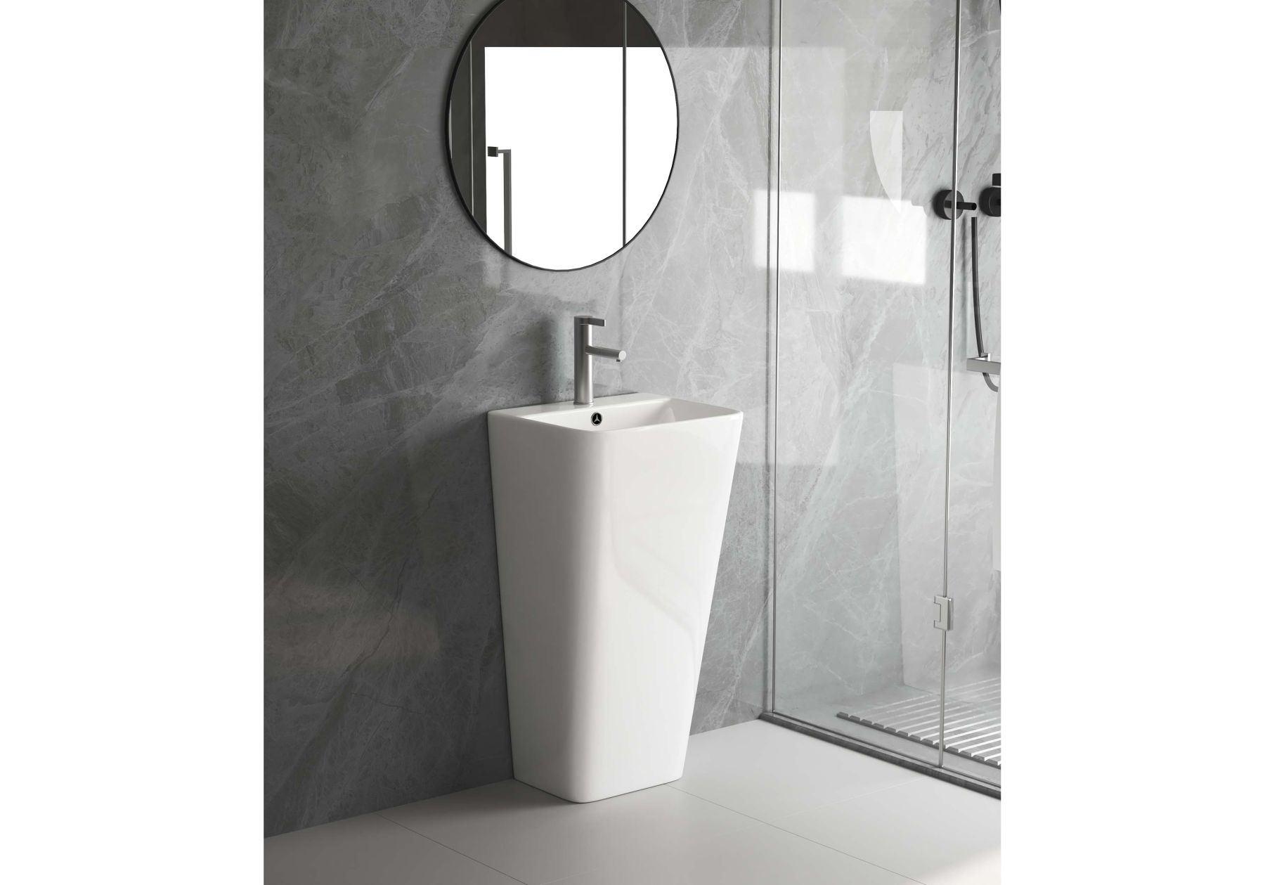 • Конструкция: состоит из монолитной чаши умывальника-пьедестала (стойки), что придаёт сантехнике изысканный и завершённый вид.