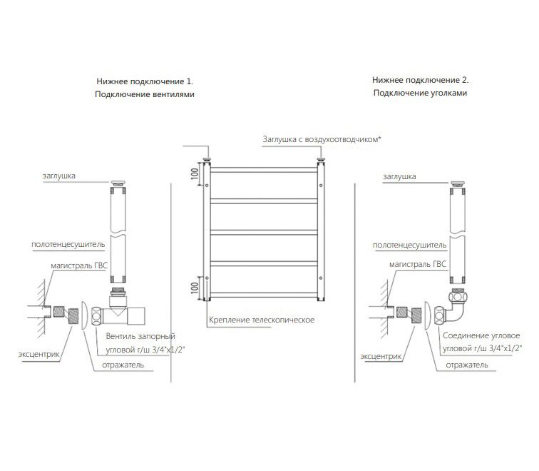 • Поверхность – глянцевая, плазменная полировка (12 класс). Подключение 2 х 1/2" (внутренняя резьба) нижнее, в торцах коллекторов.