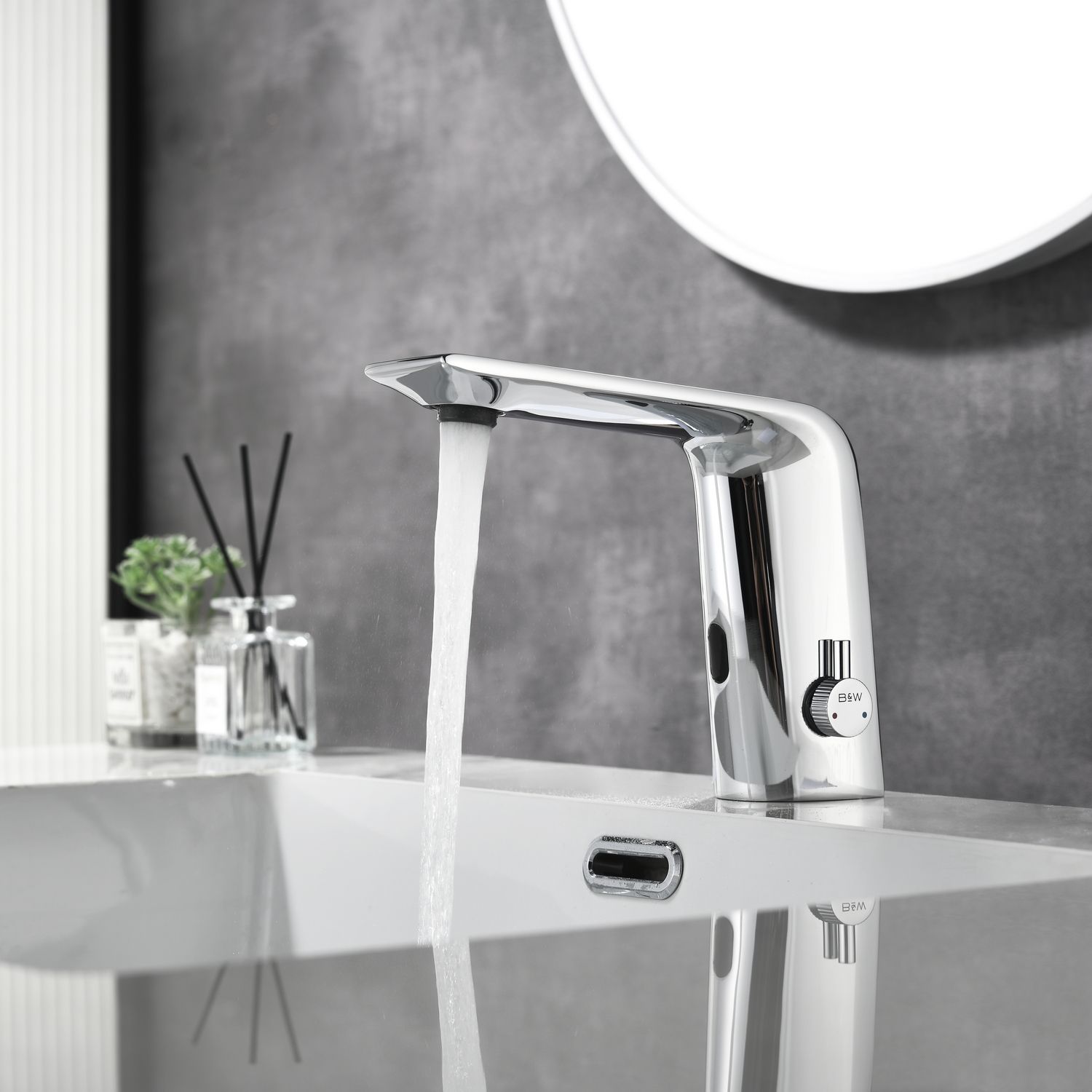Смеситель для раковины датского производителя Black&White. Изделие изготовлено из сантехнической латуни – данный материал безопасен для здоровья и выдерживает высокое давление. Сверху корпус покрыт хромоникелевым покрытием, которое не корродирует. Открытие воды происходит с помощью инфракрасного датчика, который работает на аккумуляторе постоянного тока. Данное решение гигиенично и экономит воду, особенно в общественных помещениях. Настройка температуры вынесена на ручку расположенную справа от снования. Комбинация округлого основания и плоского излива гармонично вольется в современные интерьеры ванной комнаты.
