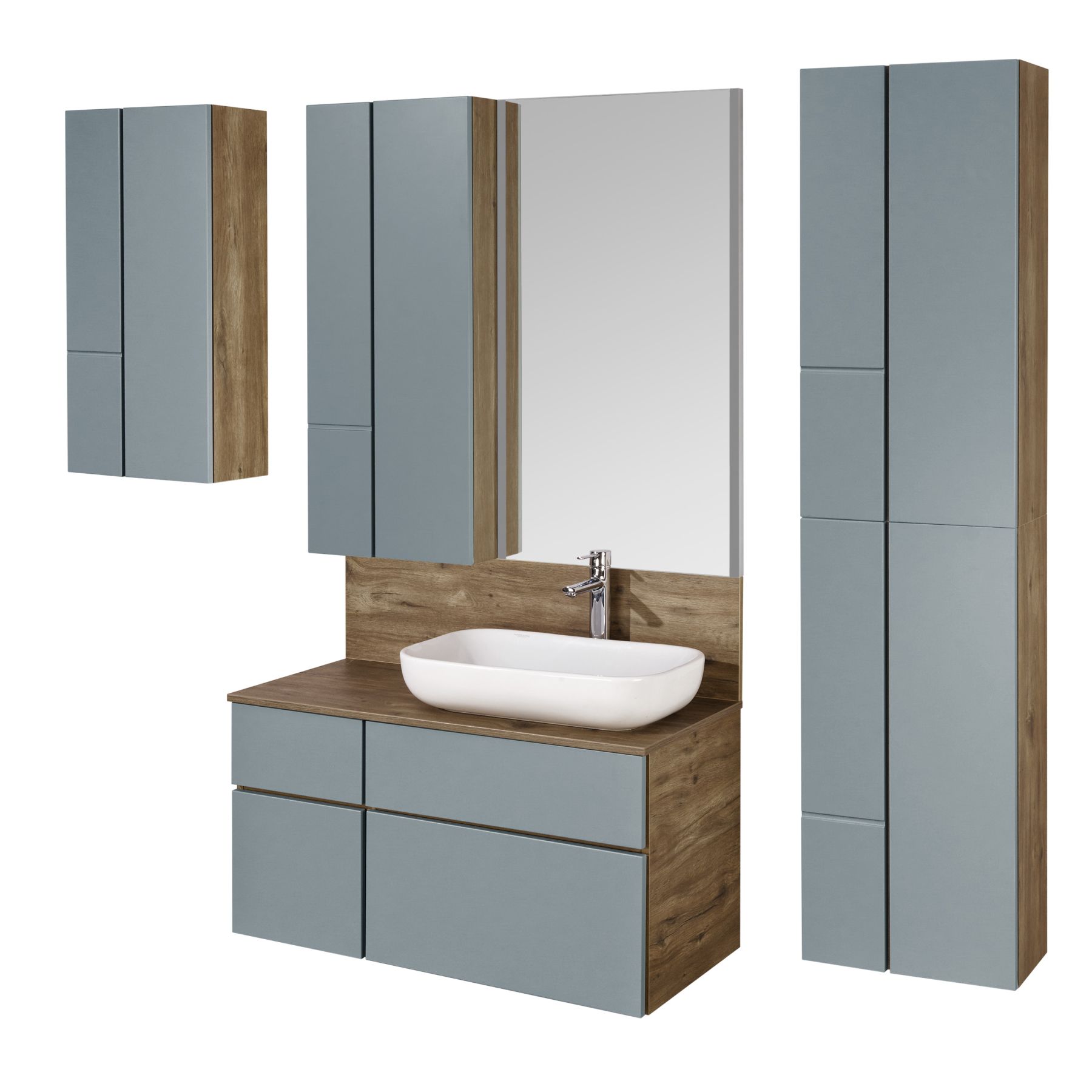 - Дизайн шкафчика повторяет тумбу-умывальник: фасады в матовой пленке фьерд сочетаются с корпусом в декоре дуб рустикальный