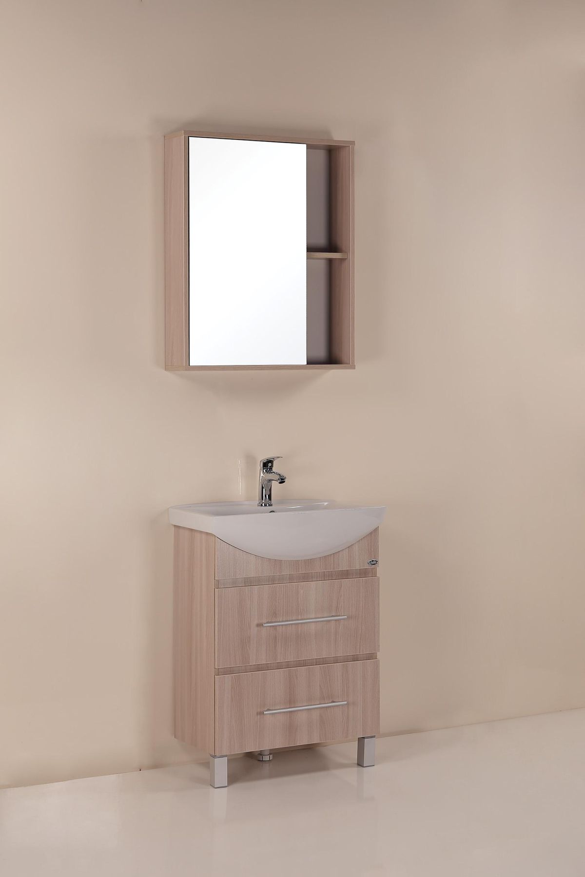 Шкаф максимально удобен в использовании: пространство за зеркальной дверцей с механизмом плавного закрывания, разделенное двумя горизонтальными полочками, позволяет компактно разместить бытовые принадлежности. 2 открытые полочки созданы специально для хранения часто используемых вещей.