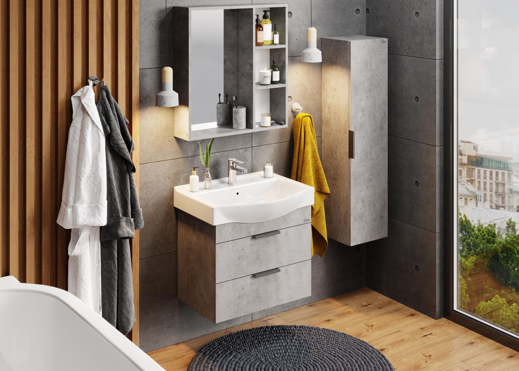 Навесной зеркальный шкаф для ванной комнаты Onika ДЕВИС 65 отличается чёткой геометрией форм и создан для тех, кто ценит современный лаконичный дизайн, холодный брутальный эффект бетона, а также безупречное исполнение.