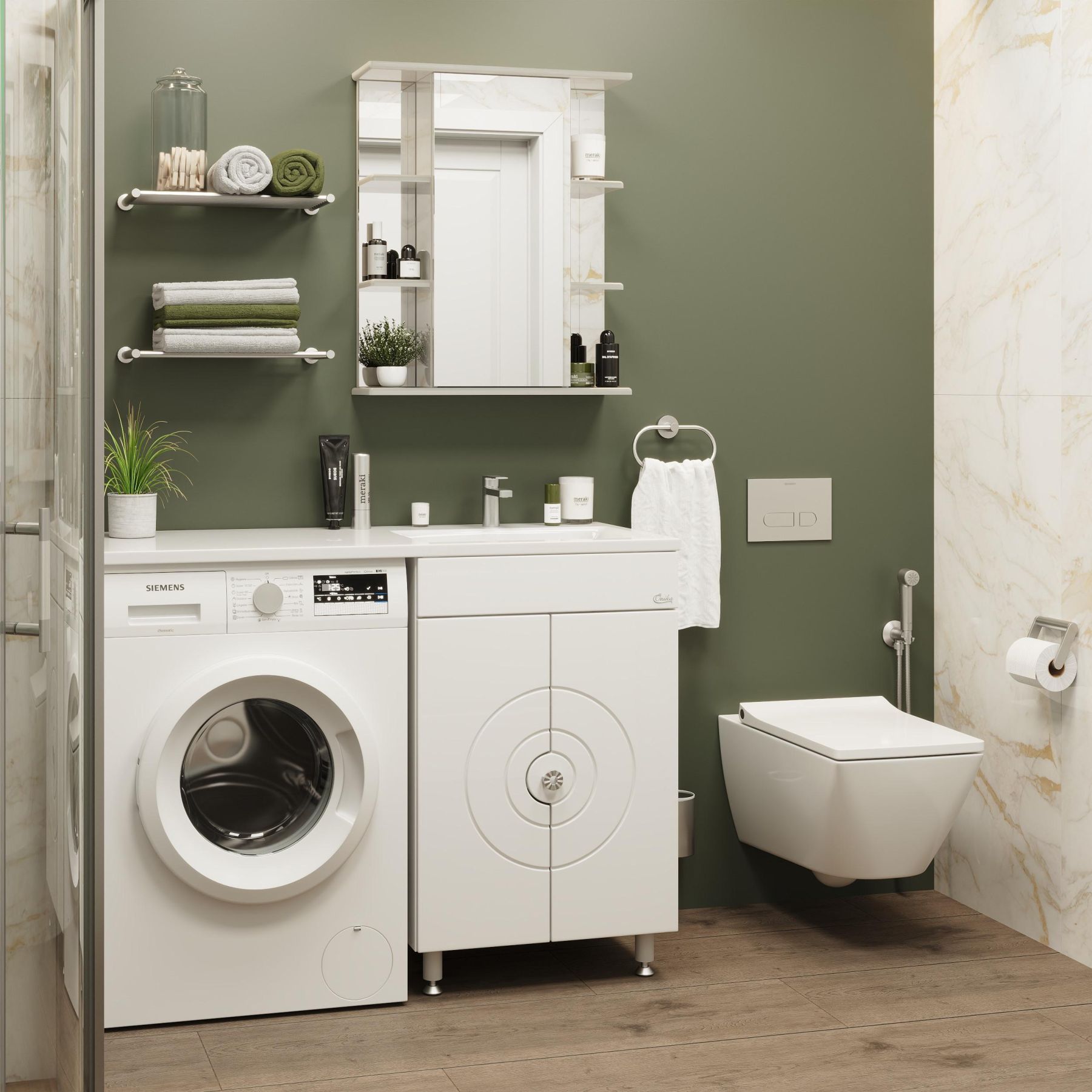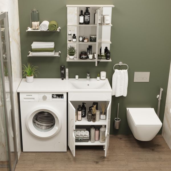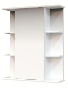 В центре шкафа - зеркальная дверца с механизмом плавного закрывания, за которой скрывается отделение для хранения, разделенное на две части горизонтальной полочкой. По бокам - открытые полочки для косметических средств или декоративных элементов.