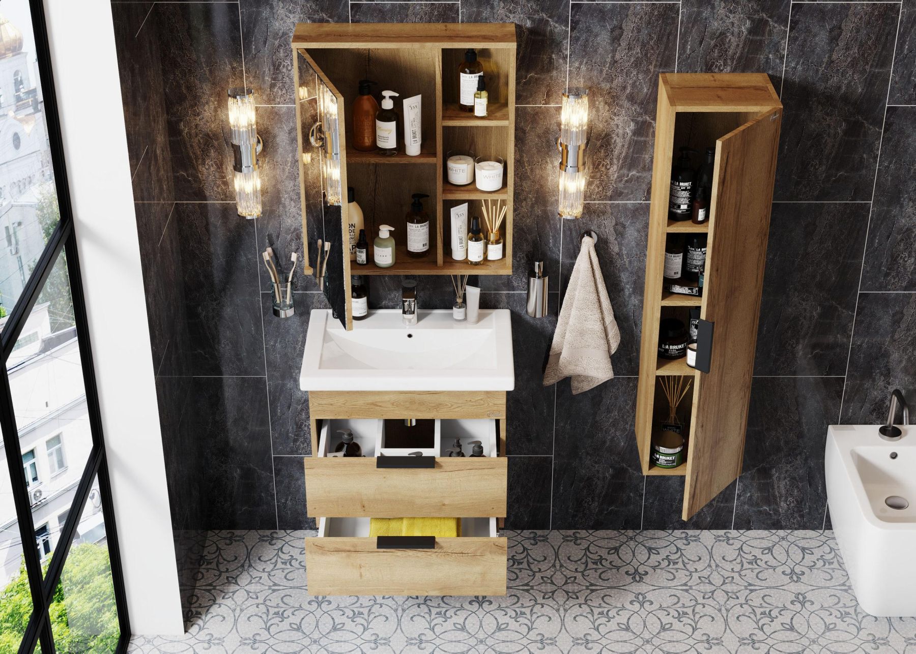 Открытые полки обеспечивают быстрый доступ к часто используемым аксессуарам, а пространство за распашной зеркальной дверцей с механизмом плавного закрывания, разделенное полочкой, станет удобным местом для хранения различных бытовых принадлежностей.
