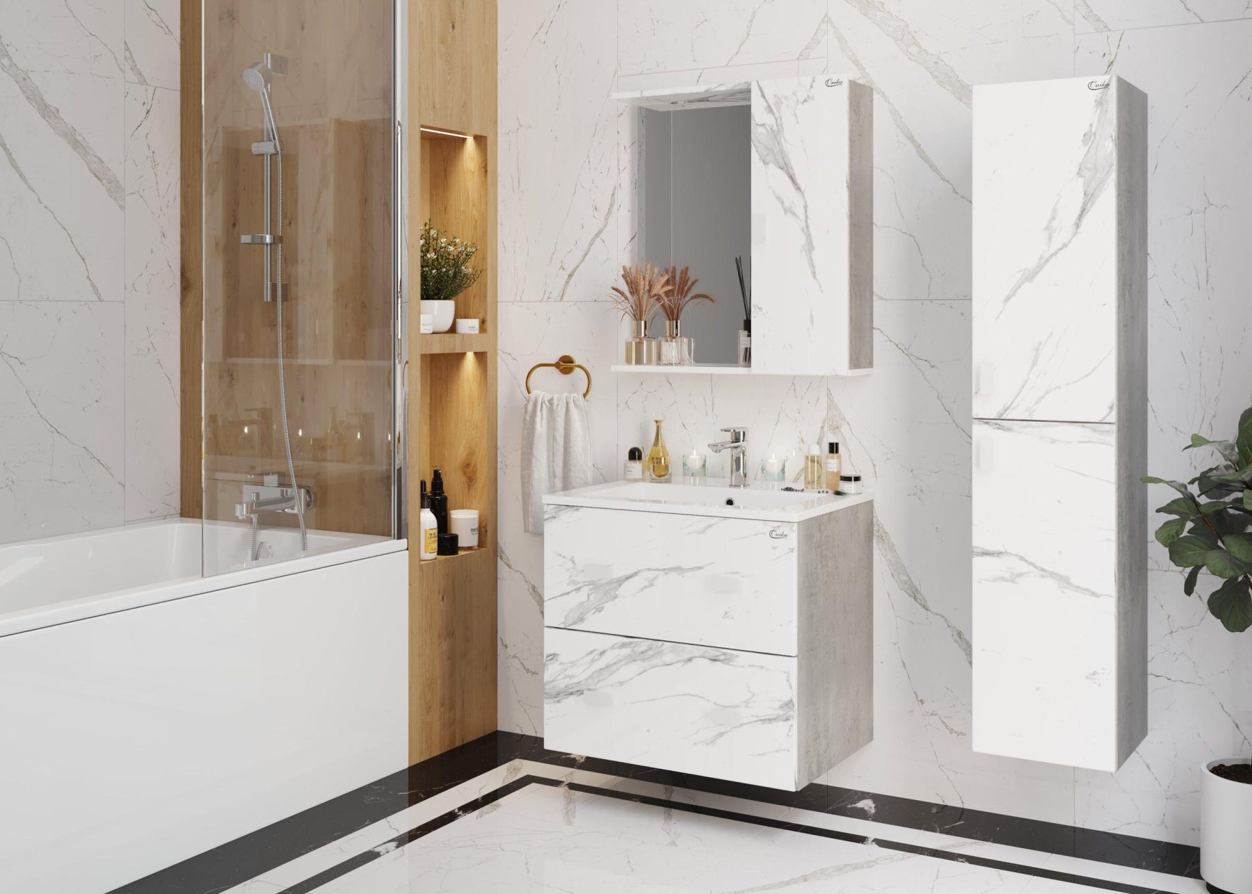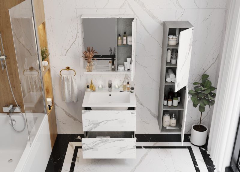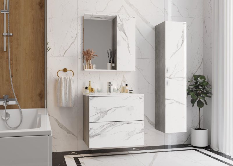 Шкаф-зеркало МАРБЛ 65 станет стильным и функциональным элементом пространства современной ванной комнаты. Спроектированный дизайнерами в минималистичном облике, зеркальный шкаф отражает самые актуальные расцветки сезона - бетон и мрамор.