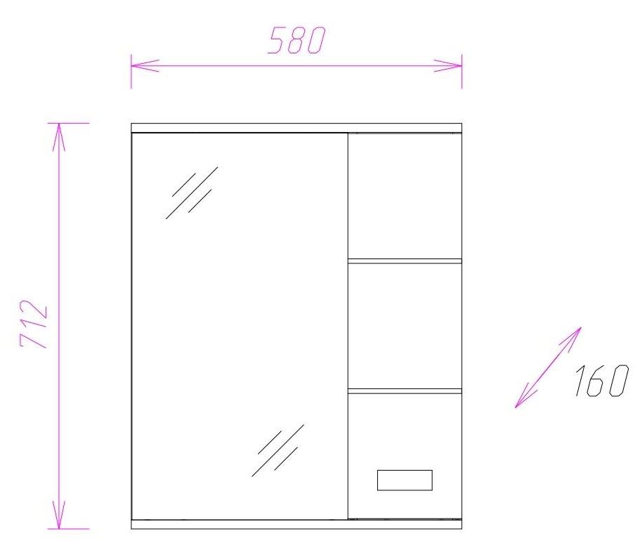 Слева от зеркала за распашной дверцей с механизмом плавного закрывания расположено отделение для хранения, разделенное на две части горизонтальной полочкой, под зеркалом - открытая полочка для косметических средств или декоративных элементов.