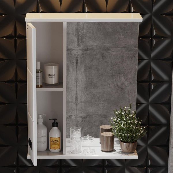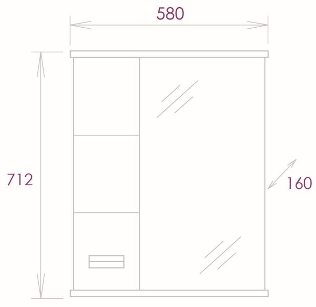 Слева от зеркала за распашной дверцей с механизмом плавного закрывания расположено отделение для хранения, разделенное на две части горизонтальной полочкой, под зеркалом - открытая полочка для косметических средств или декоративных элементов.