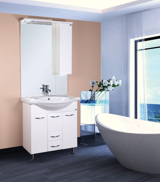 Небольшой закрытый шкафчик справа (дверца оснащена механизмом плавного закрывания) позволяет разместить необходимые мелочи. Белая глянцевая поверхность, отсутствие декора, лаконичная форма и минималистичный дизайн подойдет к любому интерьеру.