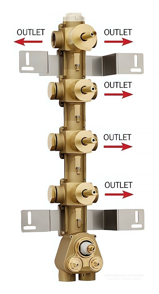 Скрытая часть для термостатического смесителя Bossini – это надежное и функциональное решение для организации системы водоснабжения. Модель разработана для подключения к пяти выходам, оснащена дивертором на два направления и тремя запорными вентилями, что позволяет гибко управлять потоками воды и использовать несколько душевых элементов одновременно.