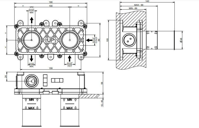 Эта скрытая часть разработана для подключения двух выходов, что позволяет легко распределять потоки воды, например, между изливом и ручным душем. Инженерные решения Gessi обеспечивают плавность управления и совместимость с различными моделями смесителей, сохраняя при этом стильный и лаконичный вид.