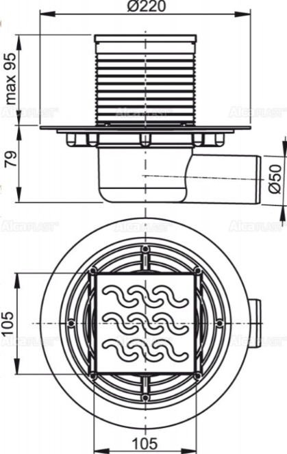 Сливной трап AlcaPlast 105 ? 105/50мм решетка - хром APV102