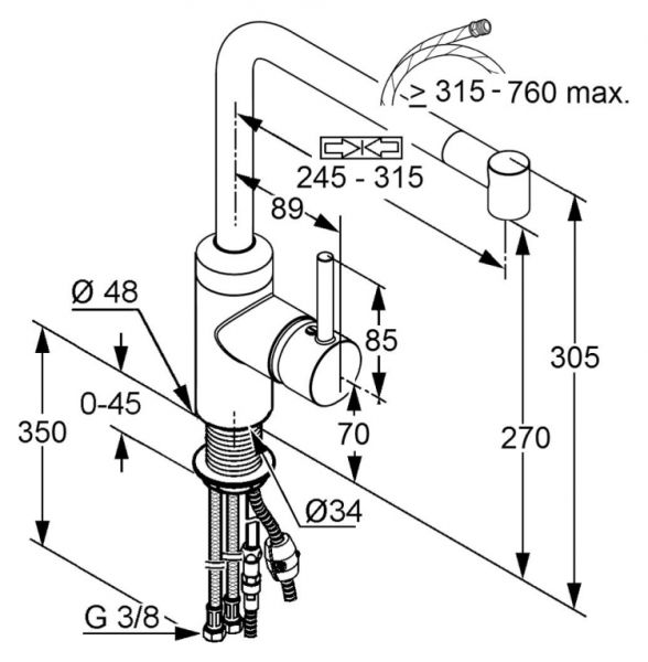 - выдвижной, поворотный (220°) телескопический излив