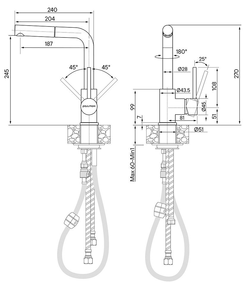 Смеситель для кухни с выдвижным шлангом, Ka214311-302Изготовлен из высококачественной латуни, которая отвечает высочайшим европейским стандартам качества, не содержит свинца, не разрушается со временем и безопасна для здоровья.Вытяжной шланг