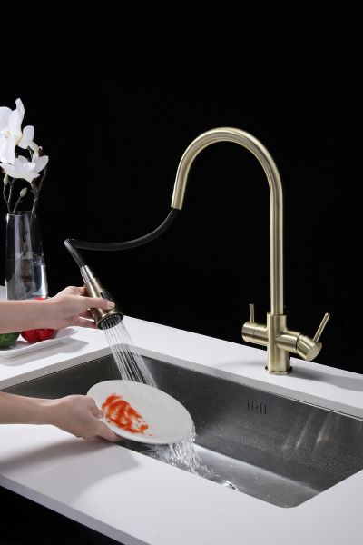 Смеситель под фильтрованную воду с выдвижным шлангом, артикул La214212-BRИзготовлен из высококачественной латуни, которая отвечает высочайшим европейским стандартам качества, не содержит свинца, не разрушается со временем и безопасна для здоровья.Вытяжной шланг