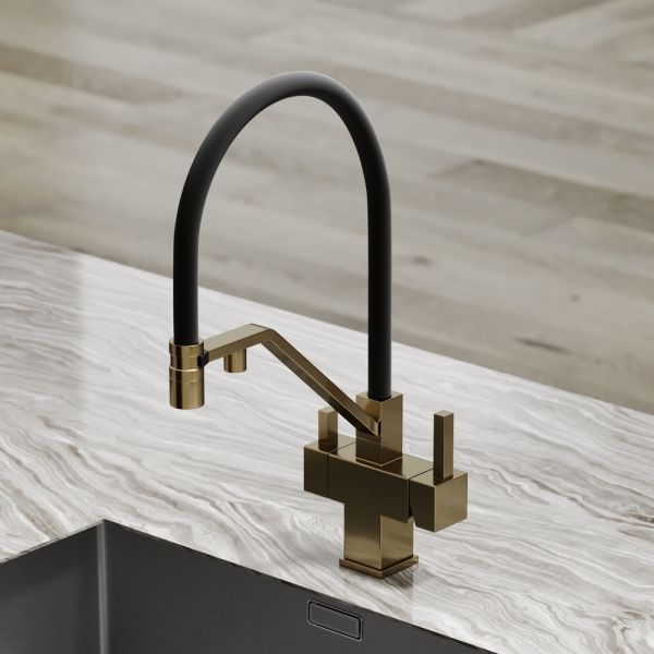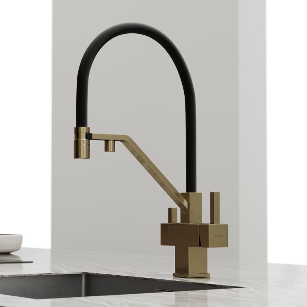 Смеситель для кухни SANCOS Loro с гибким изливом и возможностью подключения фильтра для воды, цвет брашированное золото, арт. SC4007BGФункция "Холодный старт" - при включении смесителя активируется холодной поток, для экономии горячей водыАэратор, гибкая подводка, ключ и крепления для монтажа